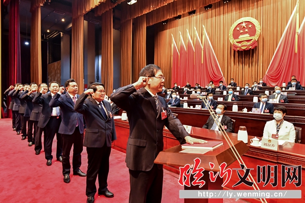 6月19日下午,大會舉行憲法宣誓儀式,新當選的市十九屆人大常委會秘書長、委員上臺宣誓