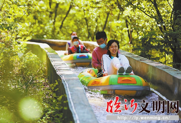 游客在沂南縣銅井鎮(zhèn)竹泉村體驗(yàn)叢林漂流。
