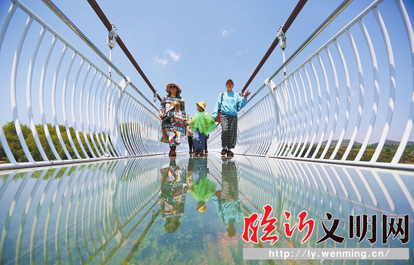 游客在沂南縣紅石寨景區(qū)體驗(yàn)高空玻璃吊橋。