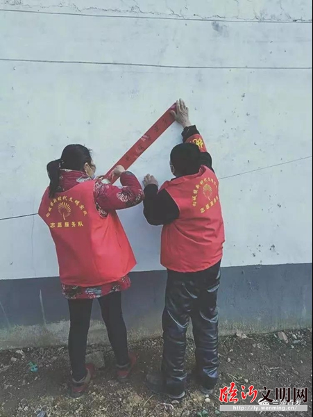 向城鎮(zhèn)新時代文明實(shí)踐志愿者在村內(nèi)張貼防控疫情標(biāo)語