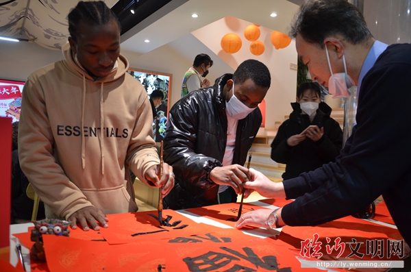 春節(jié)臨近,臨沂的年味兒隨著大街小巷高高掛起的紅燈籠愈發(fā)濃烈。1月13日,來自臨沂大學的25名外國留學生在沂州里特色商業(yè)街開啟了一場民俗文化之旅,感受了一把臨沂市井煙火里的濃濃年味兒。 學書法、捏面塑、剪窗花,當日上午9點半,25名留學生齊聚沂州禮文創(chuàng)館,零距離感受中國民俗文化。在書法區(qū),在老師的悉心指導下,留學生們鋪開紅紙,潑墨揮毫,將新春的期望和祝福全部融入筆墨間。不一會兒,一副副年味濃、寓意好,充滿喜慶、祝福、正能量的春聯(lián)在他們手中隨筆而出。在面塑區(qū),留學生們將一個個普通的彩色面團拿在手中捏、搓、揉,不消片刻,一只只呆萌可愛的小兔子便大功告成,得到了老師的贊賞。在剪紙區(qū),留學生們又化身“剪刀手”,一手握剪刀,一手拿紅紙,紙隨剪落,一開一合,一旋一彎,有模有樣地跟著學習剪紙的步驟和技巧。活動現(xiàn)場,一派紅火的新春氛圍撲面而來。
