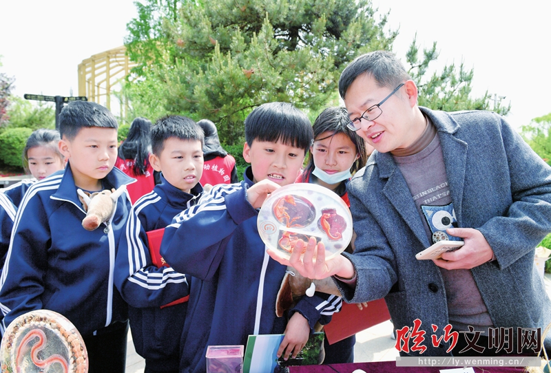 市婦女兒童醫(yī)院馬征來博士向小學(xué)生展示動(dòng)物骨骼標(biāo)本