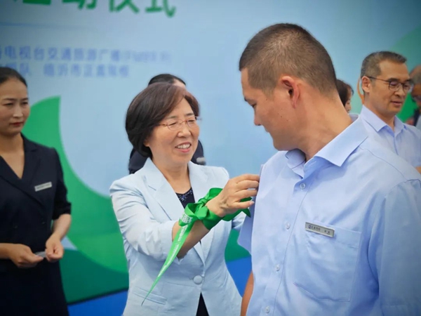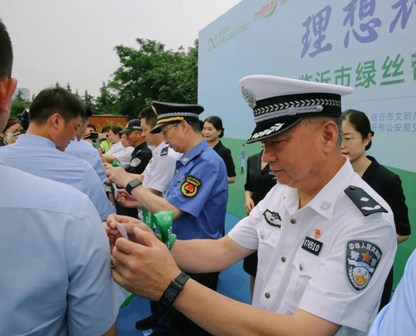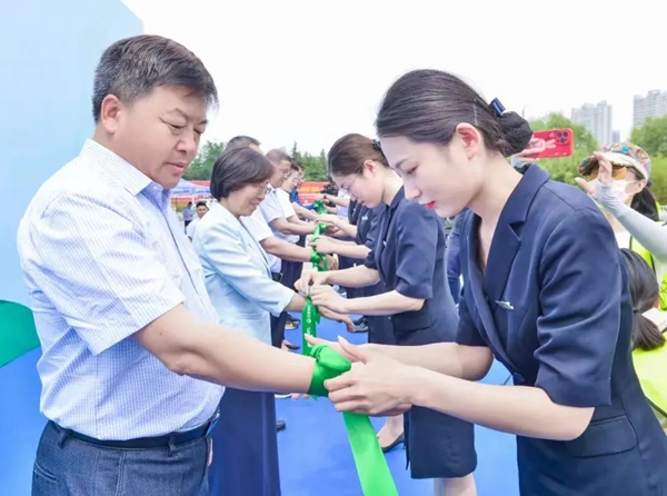 與會(huì)領(lǐng)導(dǎo)在右手腕處系上象征著平安、文明、青春、理想的“綠絲帶”