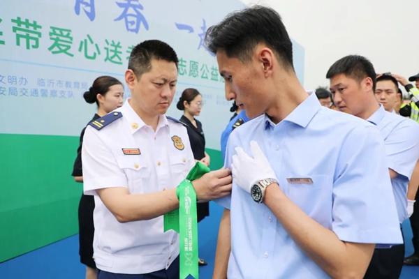 參與領(lǐng)導(dǎo)為愛心送考車隊(duì)隊(duì)長(zhǎng)佩戴臂章 一份承諾 愛心送考,是一種情懷,是傳播正能量、護(hù)航高考路的砥礪前行。