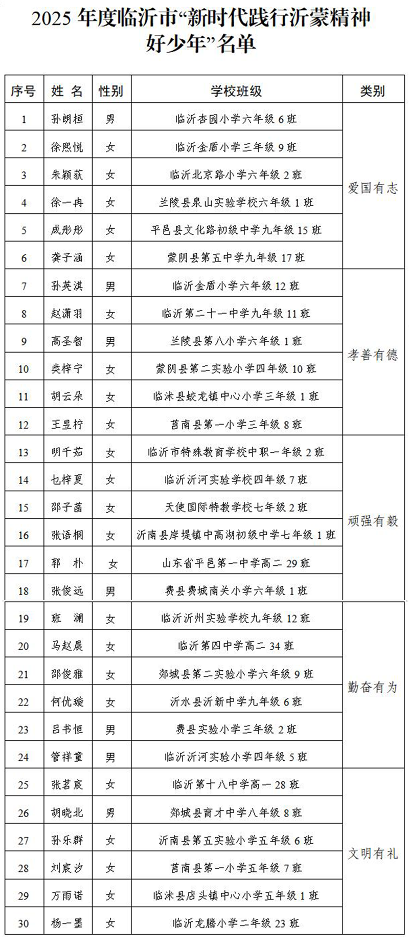 2025臨沂市“新時代踐行沂蒙精神好少年”擬入選名單公示