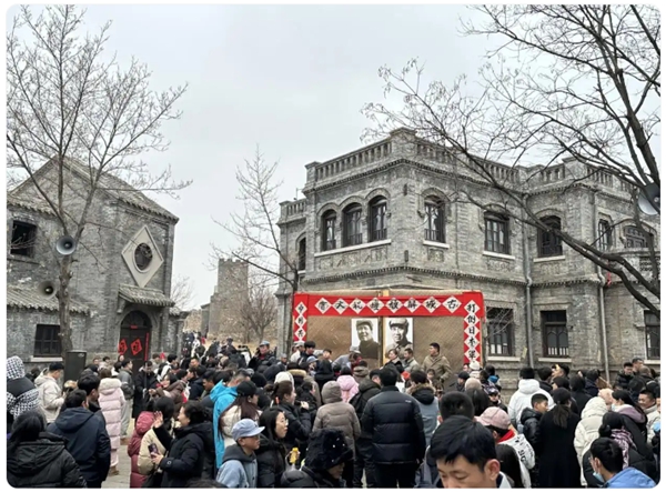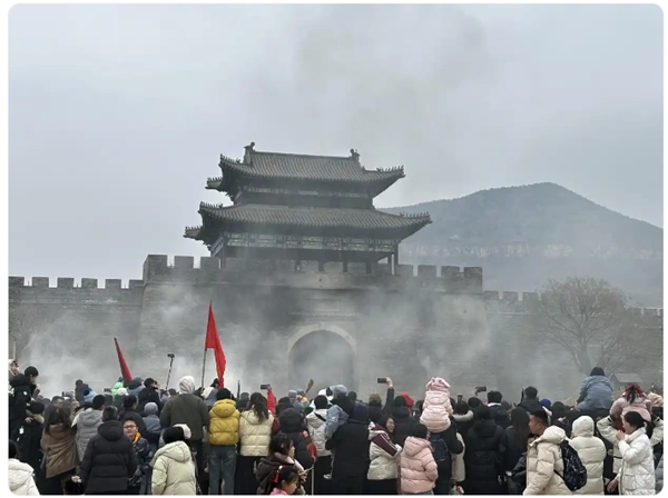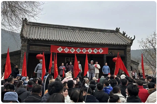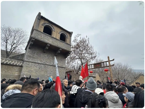(游客進(jìn)城參加“古城解放慶祝大會”。張家振/攝影) 在蛇年春節(jié)假期,紅嫂家鄉(xiāng)旅游區(qū)舉辦2025新春賀年會,通過鄉(xiāng)村節(jié)慶習(xí)俗游、古村古城體驗游、紅色文化沉浸體驗游、非遺文化體驗游等具有濃郁新春喜慶元素和紅色文化元素的活動,讓游客既可以“跟著紅色去旅游”,也可以“跟著影視去旅游”。 例如,表現(xiàn)八路軍利用婚嫁場合智取漢奸故事的紅色沉浸式演藝節(jié)目《茍隊長娶親》每天10﹕30和13﹕30各安排一場演出,分別為劇場版和行進(jìn)版。在行進(jìn)版中,游客可以參與其中,從古村戲臺跟隨演員一路體驗到古村西門,通過觀看、體驗紅色演藝節(jié)目,感受革命歲月場景,接受愛國主義教育。 據(jù)了解,這些紅色演藝節(jié)目以高度體驗性和參與性備受游客喜愛,不僅改變了游客們的游玩方式,而且改變了單一的游客身份,既可以觀看演出,也可以沉浸式參與其中,從游客變成了演員,實現(xiàn)了過把表演癮的夢想。 “山村好萊塢”旅游扶貧模式 在紅嫂家鄉(xiāng)旅游區(qū)入口處,沂蒙魂紀(jì)念碑高高聳立,《斗牛》《沂蒙》《紅高粱》等優(yōu)秀影視劇和拍攝花絮宣傳欄在道路兩側(cè)依次排開,對外展示出這一依托古山村打造的影視基地在影視產(chǎn)業(yè)中的地位。