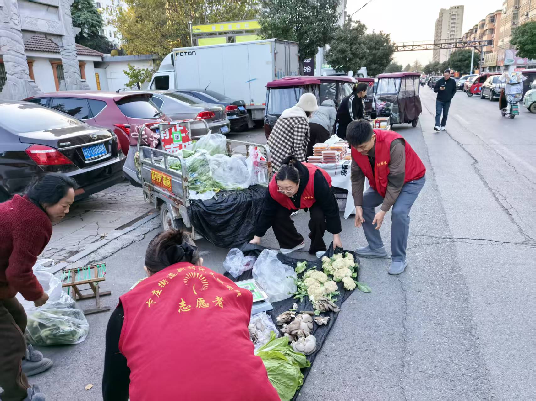 11月10日,巡邏中發(fā)現(xiàn),除流動小吃攤外,部分販賣蔬菜、水果的攤販也將攤位直接擺放在馬路兩側(cè),嚴(yán)重?cái)D占了原本供家長停放電瓶車的區(qū)域,造成道路擁堵。