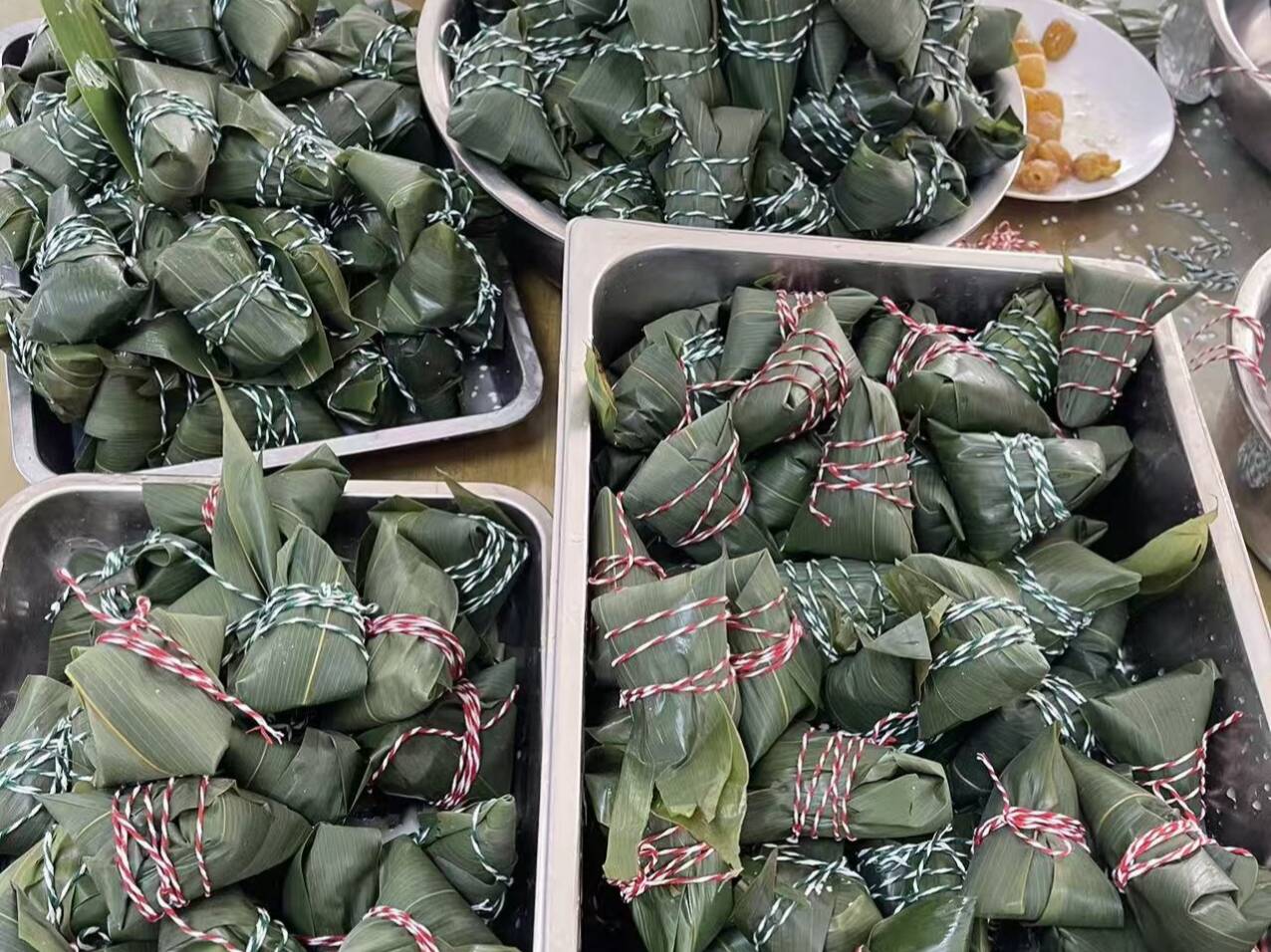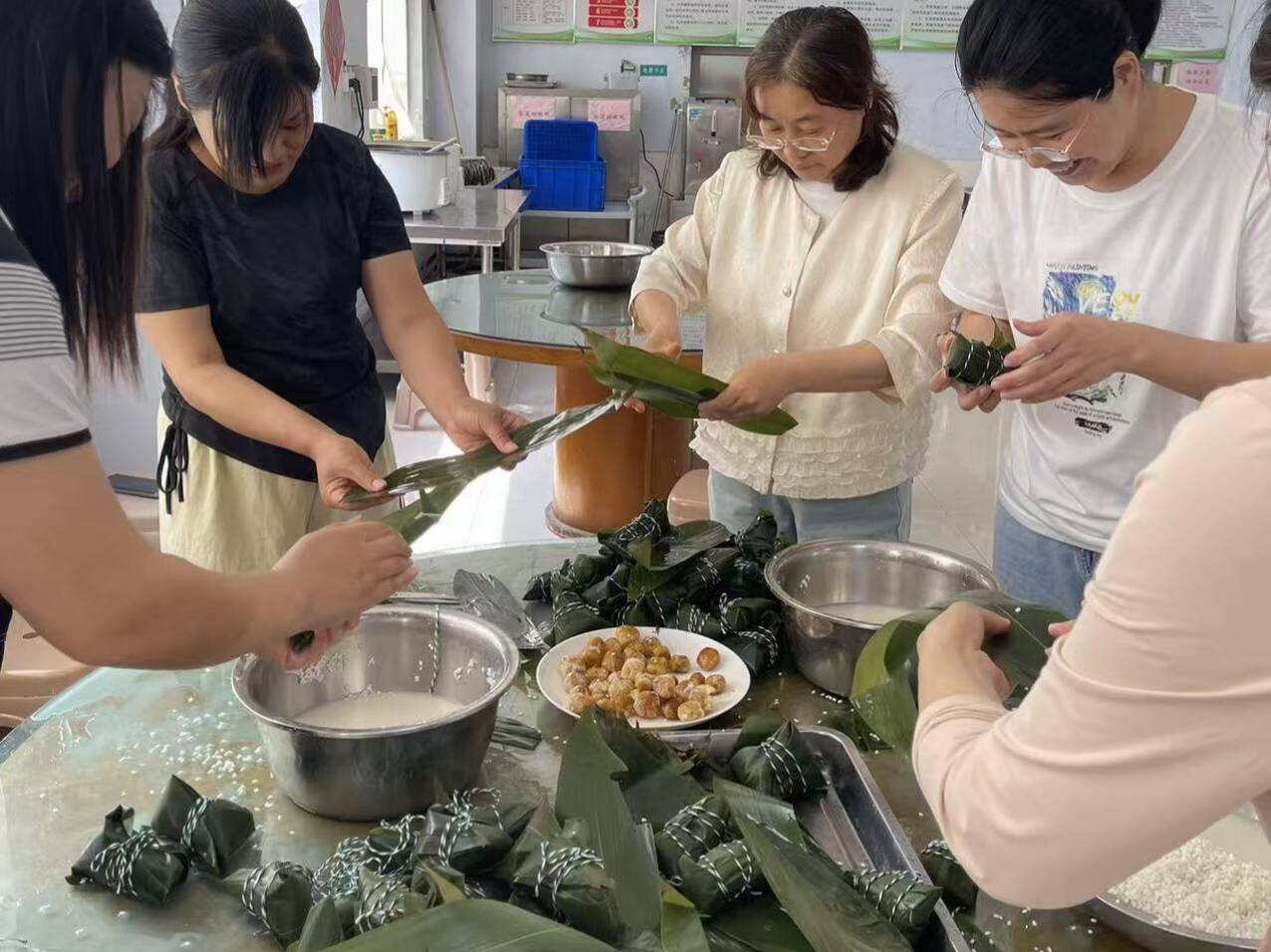與此同時(shí),餐廳內(nèi)也熱鬧非凡,包粽子活動(dòng)正如火如荼地進(jìn)行著。糯米、紅棗、粽葉等食材整齊擺放,職工們圍在一起,紛紛大顯身手。大家一邊包粽子,一邊交流技巧,現(xiàn)場歡聲笑語不斷。經(jīng)驗(yàn)豐富的“能手”們手法嫻熟,折粽葉、填糯米、放餡料、扎繩子,一氣呵成;新手們則虛心請(qǐng)教,在一次次嘗試中逐漸掌握要領(lǐng)。不一會(huì)兒,各式各樣的粽子就擺滿了桌子。