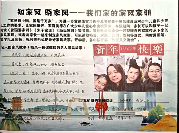 柳芽?jī)?我擔(dān)當(dāng)。 假期里,同學(xué)們積極參加家務(wù)勞動(dòng),在家庭中承擔(dān)起自己的一份責(zé)任。用實(shí)際行動(dòng)訴說(shuō)著柳芽?jī)旱呢?zé)任與擔(dān)當(dāng)。 回收環(huán)保我能行。 學(xué)校里同學(xué)們每月進(jìn)行廢紙回收,在假期里通過(guò)小手拉大手,帶動(dòng)家庭和社會(huì)共同參與環(huán)?;厥?,繼續(xù)將綠色環(huán)保、廢紙回收進(jìn)行到底! 舌尖上的中國(guó)年。 用自己的雙手為爸爸媽媽做上一頓豐盛的飯菜,用實(shí)際行動(dòng)證明孝老愛親的感恩之心,同學(xué)們紛紛化身“小廚神”,體驗(yàn)舌尖上的中國(guó)年。 童心向黨,活力無(wú)限。 生命不息,運(yùn)動(dòng)不止,假期里,同學(xué)們每日?qǐng)?jiān)持運(yùn)動(dòng)、積極參加各類展演,展現(xiàn)自己的特長(zhǎng),綻放屬于自己的精彩??。 知家風(fēng) 曉家風(fēng)。 在這個(gè)中國(guó)最重要的傳統(tǒng)節(jié)日里,同學(xué)們進(jìn)一步探尋了解了各類名人的家風(fēng)家訓(xùn),努力形成并踐行自家的優(yōu)秀家風(fēng),從而傳承中華優(yōu)秀傳統(tǒng)文化??。 柳芽?jī)?nbsp;繪夢(mèng)想。 新年新夢(mèng)想,同學(xué)們紛紛寫下自己新一年的目標(biāo)和理想,在即將開啟的新學(xué)期中,向著夢(mèng)想出發(fā)!