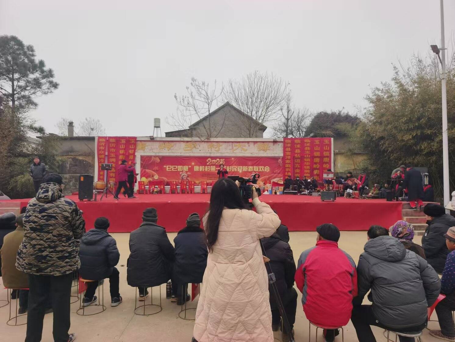 恰逢唐嶺大集,前來趕年集的群眾都被這場精彩的春晚吸引。廣場上張燈結彩,大紅燈籠與紅色飄帶交相輝映。舞臺背景板上“‘巳巳如意’唐嶺村第一屆迎新春聯(lián)歡會”的字樣在陽光的照耀下熠熠生輝。隨著一陣歡快的鑼鼓聲,聯(lián)歡會正式拉開帷幕。