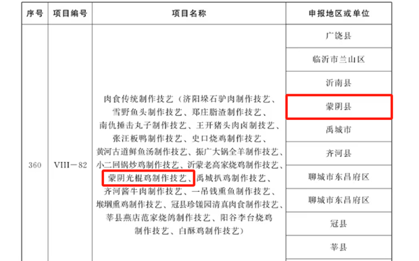 近日,山東省人民政府公布了第六批省級(jí)非物質(zhì)文化遺產(chǎn)代表性項(xiàng)目名錄,蒙陰縣光棍雞制作技藝、耿氏中醫(yī)傳統(tǒng)療法、李氏中醫(yī)調(diào)補(bǔ)元?dú)鈧鹘y(tǒng)治療法3個(gè)項(xiàng)目入選。截止目前,蒙陰縣共有省級(jí)非物質(zhì)文化遺產(chǎn)保護(hù)項(xiàng)目9項(xiàng)、市級(jí)45項(xiàng)、縣級(jí)332項(xiàng)。 蒙陰光棍雞制作技藝