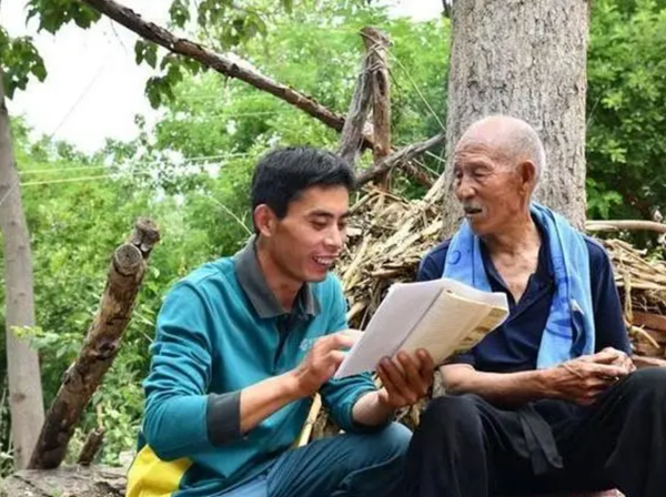 王德建(左)在走訪烈士信息 他叫王德建 是中國郵政公司蒙陰分公司 坦埠支局的一名普通投遞員 10年,45位烈士 這場不同尋常的“尋親”之路 感動(dòng)了無數(shù)人 他用一抹“郵政綠” 擦亮了崮鄉(xiāng)“沂蒙紅” 01 盡職盡責(zé) 十年如一日?qǐng)?jiān)守崗位