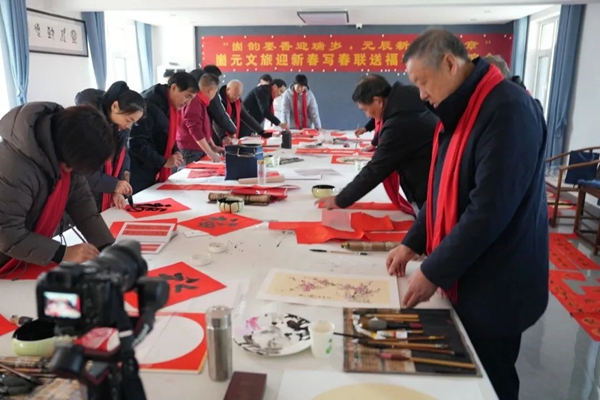 晚會(huì)舉辦期間,蒙陰縣書法家協(xié)會(huì)、縣美術(shù)家協(xié)會(huì)、縣青年美術(shù)家協(xié)會(huì)的志愿者老師們還現(xiàn)場(chǎng)揮毫潑墨,免費(fèi)為鄉(xiāng)親們書寫福字與春聯(lián),將新春的祝福與美好的愿景融入一筆一劃之中。此次活動(dòng)共書寫春聯(lián)200多副、“?!弊?00多個(gè),創(chuàng)作書畫作品60余幅,把節(jié)日的文化祝福送到了群眾家門口。 |