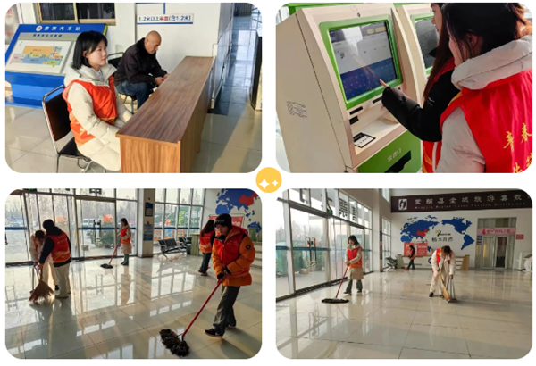 在售票大廳,青年志愿者們分工明確,各司其職。他們細心指導(dǎo)不熟悉網(wǎng)絡(luò)購票的旅客使用自助售票機,解答關(guān)于車次、票價等各種問題,確保每一位旅客都能順利買到車票,并對汽車站內(nèi)外進行全面衛(wèi)生打掃。