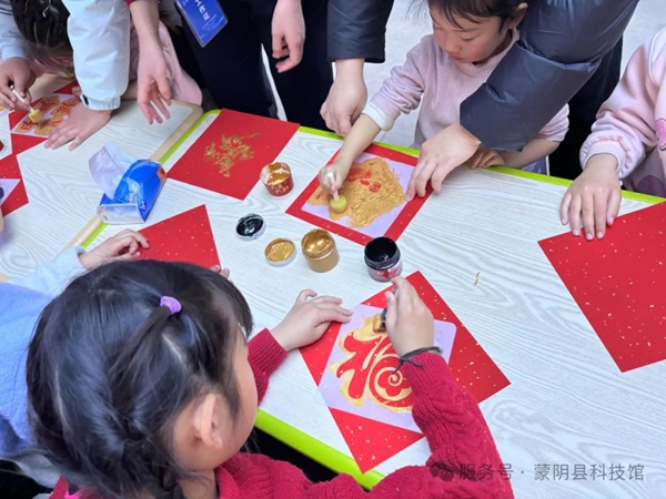 為弘揚傳統(tǒng)文化、普及科學知識,營造喜慶祥和的節(jié)日氛圍,蒙陰縣于2月1日至4日精心策劃并開展了“金蛇迎春”春節(jié)系列科普活動。本次活動以“傳統(tǒng)與科技交融”為主題,為青少年及家庭帶來了一場寓教于樂的文化與科學盛宴。 一、活動內容與成效 ?、?福字拓印DIY手工活動 通過拓印傳統(tǒng)“福”字,結合春節(jié)習俗講解,參與者不僅親手制作了獨具匠心的新春作品,更深入了解了春節(jié)的歷史淵源與文化內涵?;顒右浴皠邮?學習”的模式,讓傳統(tǒng)文化在體驗中煥發(fā)新活力,現(xiàn)場共完成作品40份,深受家長與兒童好評。