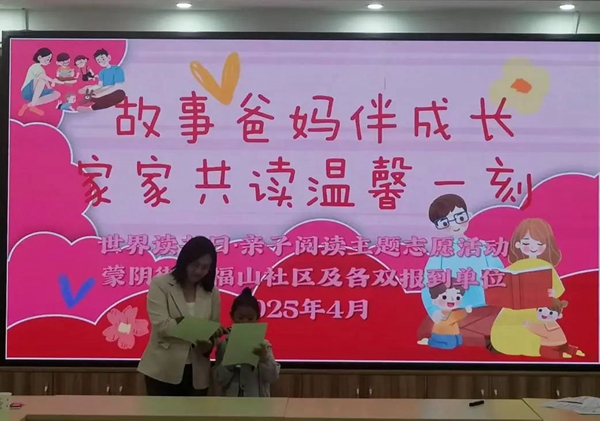 為進一步倡導(dǎo)全民閱讀,培養(yǎng)家庭閱讀興趣,引領(lǐng)親子閱讀,促進家庭情感交流,營造書香四溢的社區(qū)文化氛圍,在第三十個世界讀書日來臨之際,4月18日,蒙陰縣福山社區(qū)開展“故事爸媽伴成長·家家共讀溫馨一刻”親子共讀活動。