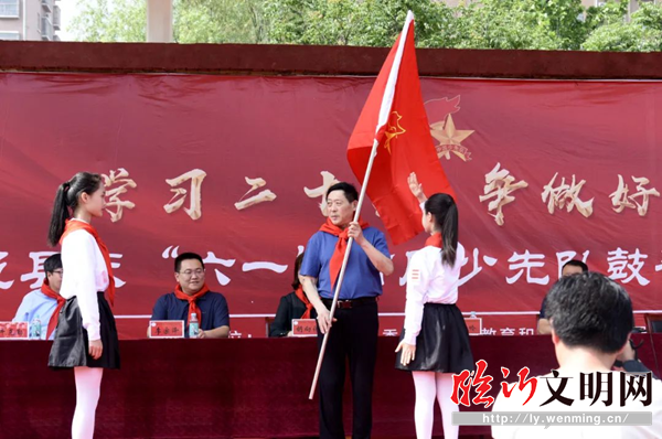 活動(dòng)第一項(xiàng)由縣關(guān)工委主任廉茂嶺授少先隊(duì)大隊(duì)旗。 出旗