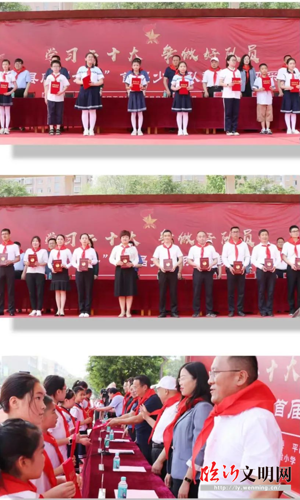 隊(duì)旗飄揚(yáng),星星火炬閃耀光芒;隊(duì)歌嘹亮,唱出心中崇高理想。2023年 5 月31 日上午,在第73個(gè)“六一”國際兒童節(jié)來臨之際,由共青團(tuán)平邑縣委、平邑縣教育和體育局、平邑縣少工委聯(lián)合主辦的慶?!傲弧眱和?jié)暨“學(xué)習(xí)黨的二十大 爭做好隊(duì)員”鼓號(hào)操風(fēng)采展示活動(dòng),在平邑縣第四實(shí)驗(yàn)小學(xué)舉行。 第一階段 第一項(xiàng):授旗