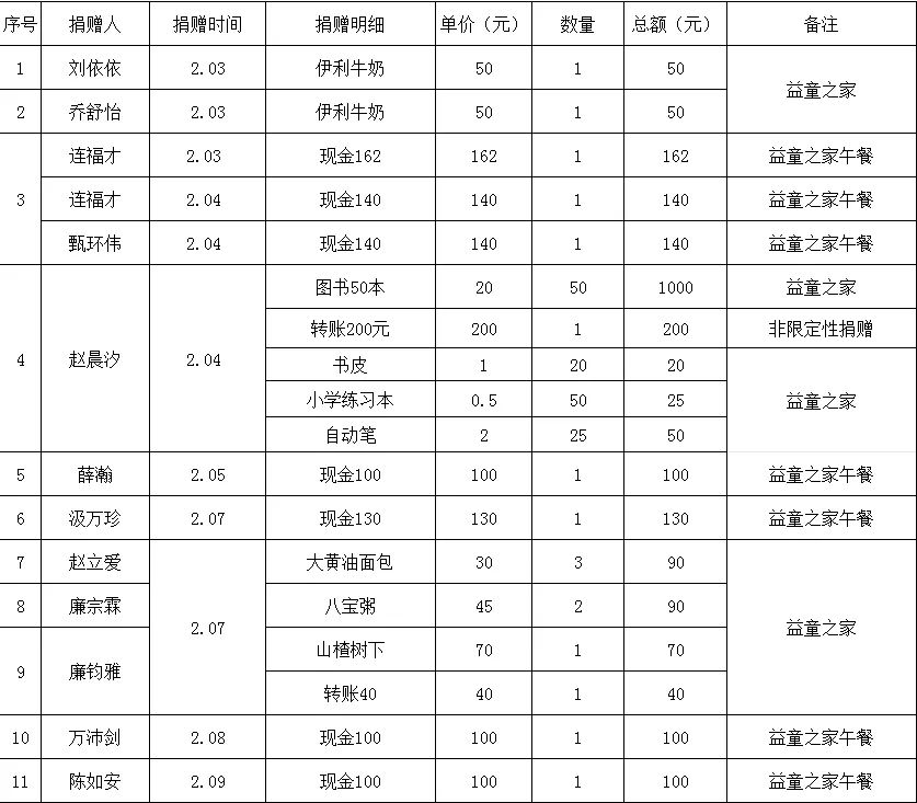 在“益童之家"的學(xué)習(xí)時(shí)光,困境兒童們紛紛表示,這個(gè)假期過得很幸福,感謝志愿者們的溫暖陪伴,他們很珍惜這次難得的機(jī)會(huì),會(huì)努力學(xué)習(xí),將來回報(bào)社會(huì)?!耙嫱摇标P(guān)愛困境兒童志愿服務(wù)活動(dòng)的成功舉辦,不僅彰顯了協(xié)會(huì)對困境兒童的深切關(guān)懷,也傳遞了社會(huì)正能量,為推動(dòng)社會(huì)和諧進(jìn)步貢獻(xiàn)了一份力量! 此次活動(dòng),困境兒童們不僅收獲了知識,更在心靈上得到了慰藉。非常感謝以下愛心人士的大愛付出!