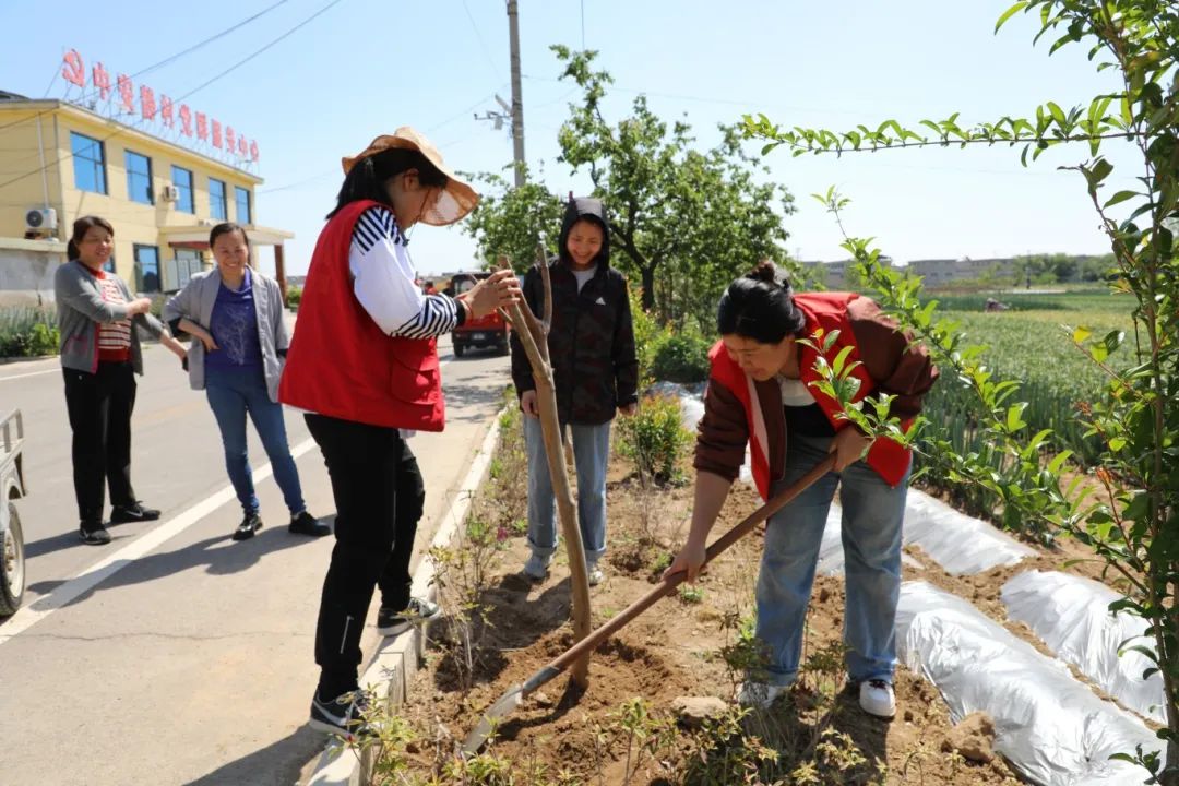 4月28日,在沂河新區(qū)白沙埠鎮(zhèn)中安靜村,村“兩委”成員同城鄉(xiāng)公益性崗位人員、新時(shí)代文明實(shí)踐巾幗志愿者一起栽植綠化苗木。