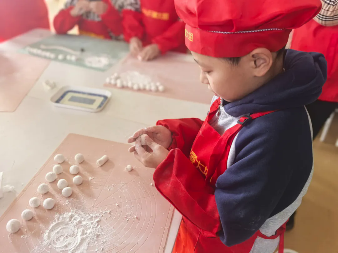 在活動現(xiàn)場,孩子們圍坐一起,在專業(yè)中式面點師的悉心傳授下,孩子們聚精會神地學(xué)習(xí)包湯圓技巧,從和面、團餡到封口、搓圓,每一步都蘊含著大家的熱情與用心。