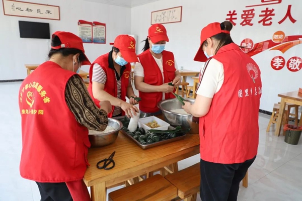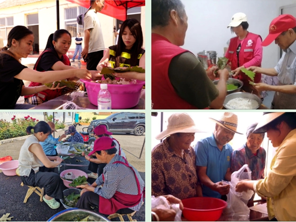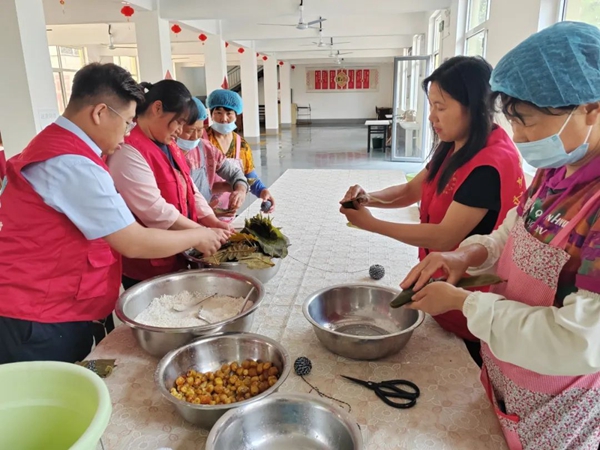 “包粽子嘍!”5月30日上午,圈里鄉(xiāng)澇坡村、馬家土峪村幸福食堂的桌子上擺滿了翠綠的粽葉、雪白的糯米和棕黃的蜜棗,由黨支部組織,村“兩委”成員、志愿者組成的志愿服務隊正緊鑼密鼓地給老人包粽子。 “下鍋嘍!”澇坡村的志愿者們將粽子一個個放入鍋內;而在馬家土峪村,粽子們則安靜地排好隊被推入蒸車內,在蒸氣的撫慰下逐漸變得軟糯香甜,散發(fā)著陣陣清香。出鍋裝盤,在幸福食堂就餐每個老人都分到了粽子,臉上洋溢的笑容,是甜蜜生活最好的詮釋。