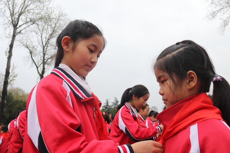 臨沂金雀山小學少工委委員張繼偉宣讀了新隊員名單,張淼、陶博等180名學生被批準加入中國少年先鋒隊,光榮成為少先隊組織的一員。在嘹亮的《紅領(lǐng)巾心向黨》旋律中, 老隊員代表鄭重地把紅領(lǐng)巾為新隊員佩戴在胸前。少先隊大隊輔導(dǎo)員范海燕帶領(lǐng)新隊員宣誓、老隊員重溫入隊誓詞,嘹亮的誓言傳遞著每個少先隊員當好接班人的決心和信心。 臨沂金雀山小學黨總支書記、少工委主任劉士華宣讀了新建中隊及輔導(dǎo)員聘任名單。與會領(lǐng)導(dǎo)為新建中隊授旗、為輔導(dǎo)員頒發(fā)聘書。