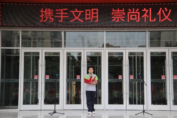 升旗儀式上紅領(lǐng)巾宣講員馬藝晨進(jìn)行《攜手文明 崇尚禮儀》主題宣講,她倡導(dǎo)隊(duì)員們禮貌待人,熱心助人,勤儉節(jié)約,講究衛(wèi)生,努力成為優(yōu)秀的社會(huì)主義接班人。